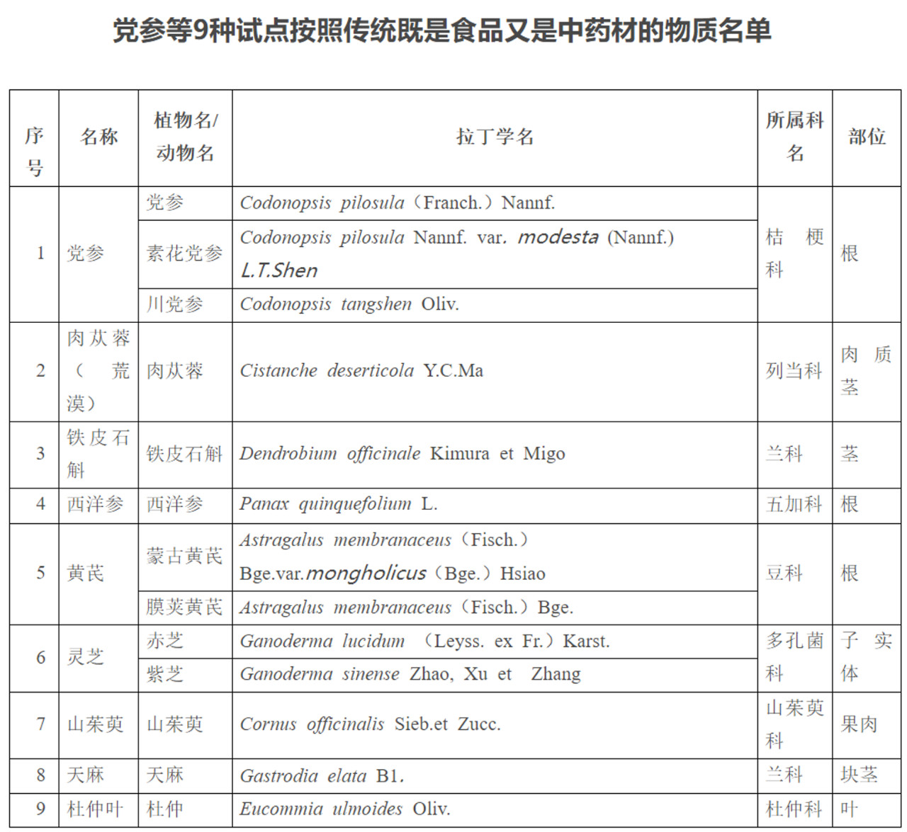 健康委员会、国家市场监管总局近日也联合发布《关于对党参等9种物质开展按照传统既是食品又是中药材的物质管理试点工作的通知》。