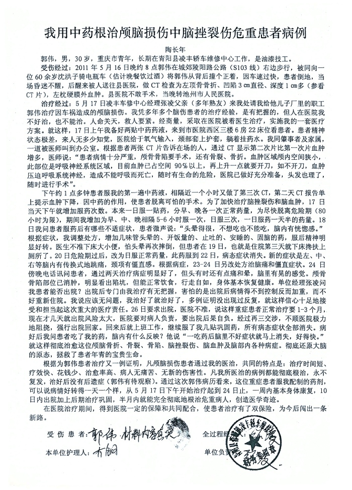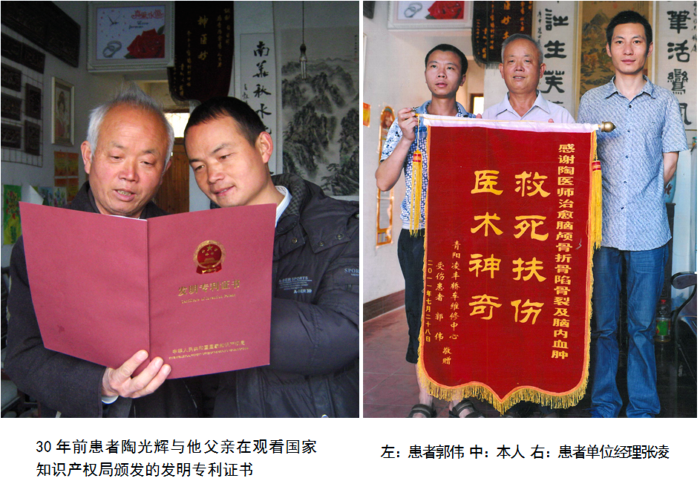 陶长年 凡人奇才,字隐,名长年,安徽省九华山佛教圣地人。2015年任中国民间中医医药研究开发协会咨询开发部专家顾问委员会常委、主任委员;并入选中国未来研究会编辑出版的《推动中国的领军人物》;全国优秀专利项目评选中荣获:“最佳创新投资奖”。他自幼习医、学画,终生勤专苦研,敢于创新,勇于实践,加上心灵神会,使医、艺二类获得成果。何为追之二类?追艺在于人类精神享受;研医目的使患者生命延长。 艺术类:书画70年代被选拔出席省、地展;自创(中型)雕塑12生肖(兽首武将人身)即将问世;自创新颖葫芦雕画;尤其是树根造型(简称根艺),1985年被青阳、安庆、南京等省、市、县邀请举办个人展览,受到国内外高度评价;如美国国际计划交流理事会主席科特·卡茨基在南京参观留言簿上写道:“这是我在中国看到的最有意思、最漂亮的艺术,他需要思想和知识。”世界大洋洲研究中心主席、澳大利亚拉特布大学教授家博先生写道:“木材,天才,艺术真棒。”作品被美国、日本、法国、荷兰、新加坡等十几个国家外宾收藏。1986年安徽芜湖市政府到日本考察带上他6件根艺作品作为珍贵礼品赠送日本。由于他的特殊贡献,当时青阳县政府曾给予晋升一级工资嘉奖,事迹被载入青阳县志史册和中国文艺家大辞典。作品多次在全国、省、市参展和报刊发表,论文在中国花卉盆景1986年第一期上发表,1987年该刊第7期又刊载了“他用树根敲开了艺术的大门”专访。另外他还擅长盆景制作和假山制作、堆垒,园林造景、绿化等。 医学类:根治颅脑损伤已获国家发明专利。专治脑出血、脑血肿、血瘀、脑水肿、脑肿胀,醒脑固脑快,脑髓震伤,脑震荡、脑挫裂伤、颅骨骨折等。具有治疗时间短、疗效快,能彻底根治,不留后遗症,并永不复发,但治疗要及时,越早越好。还善治脑伤后遗症、脑手术后遗症、慢性脑血肿转脑积液等,这些病症都是目前国内国际医学界无法根治的疑难病症。还擅长中风瘫痪半年内康复治疗,患者基本都能康复和痊愈,50岁以下约一个月左右能自走,两个月左右能下蹲。另外对痛风一次外敷就止痛治愈。还有跌打内外伤、陈旧老伤、颈椎、腰椎病、风寒风湿等都有很好的疗效。 脑伤危害大 药到病自除——浅论中草药能彻底根治颅脑损伤 陶长年 用中草药治病,是我国传统医药学界独特的学术理论体系和丰富的实践经验,有数千年的发展历史,至今仍然发挥着重要的医疗保健作用。中草药的开发和研究,历代医药学家作了不懈的努力,留下了大量的文献资料,成为宝贵的文化遗产,是我国传统医学的“伟大宝库”为世界所瞩目。颅脑损伤是一种常见的外伤疾病,有的发生在劳动时受伤,有的被打伤,有的摔跌伤,更多的是车祸损伤,还有自然灾害地震造成损伤,如果不及时抢救,重者危及患者生命。研究药物,根治病情,是广大医务工作和专研医学爱好者所追求的一个课题。不断地探索,发明治疗新方法,将是对患者,对社会,甚至对人类献出一份爱,保护人类健康,是很有意义的。 颅脑损伤的医治,是我几十年业余爱好,研究中医中药成果。2013年10月23日由国家知识产权局颁发的发明专利证书,肯定了这一成果。实践多例病例证明,用中草药完全可以根治。治愈颅脑损伤中“脑震荡、脑挫裂伤、脑血肿、脑瘀血、脑肿胀、醒脑快、减颅压以及颅骨骨折、骨裂、骨陷等颅脑伤所出现的严重病症。有人要问,你一不从医,二无家庭医学背景,却研究医学课题,而且是在医学界尚无法彻底根治颅脑损伤造成危害的重大课题,简直使人不可思议,是吹牛,你说你了不得,是要有证据的,用事实说话,用理来征服人心。首先你能不能谈谈你是怎么爱好医学的,再谈谈怎么又研究起颅脑损伤诊疗的? 说来话长,我出生在一个贫寒的农民家庭,父母都不识字,在我年幼时,父亲就教育我说:“旧社会,我们无钱读书,都不识字,新社会你要好好读书,要吃苦中苦,方为人上人。”而我的本性是算上一个勤奋好学的,遇到稀奇的东西都喜欢思考,甚至研究一番。我小时候,家乡有一位武术师叫王承记,也是我亲戚,擅长武术,推拿治伤接骨,远近闻名,解决了无数的伤痛患者痛苦。救死扶伤,是我国传统美德。在我小时的一次受伤中,经王师傅推拿、服药治愈,解除了我的痛苦,使我从内心感到十分羡慕和感激,后来专心向他请教、求学,王师傅向我指点了二、三推拿技法,后又自己专研中医药学和伤科文献,在上世纪60至70年代青少年时,我便开始为人推拿,用药,收效很好,认为解决一人痛苦,等于做了一件好事,自心欣慰。 70年代是我青年时代,由于我至幼就喜欢写字、画画,再经历文革年代的磨炼,写画成了我的特长,就这样72年步入到文化单位工作,业余时帮熟人、亲戚、朋友做些伤科推拿治疗。 1985年3月的一天,是我终身难忘的日子。事出一个懂事又不懂事的15岁少年吴小满,从飞驶大货车上跳车摔伤,当场昏迷,后一直昏迷不醒,送大小医院都不救治。上世纪80年代县市级医院一般都不敢进行颅脑手术,那时农民家庭也很穷,大城市医院无钱去,只好在家等死。患者头、脸都肿胀严重变形,如面包、似软柿。平躺着四肢伸直丝毫不动,已经三天三夜,患者和我亲同手脚。无法,救人心切,逼我上阵给患者医治试试,俗话说:“死马当作活马医”。家人日夜守候,认为有随时死亡的可能,就这样在第四天开始我组方配药,煎